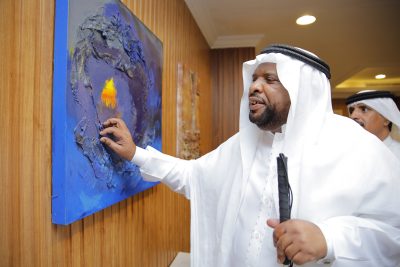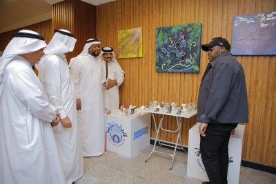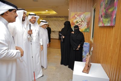 بدأت الفعالية بافتتاح معرض الفن التشكيلي الذي شاركت فيه الفنانة إيمان علاوي والفنان فارس بكر، حيث عرضت علاوي عدد من اللوحات التي تجسد الفن السريالي بأسلوب حسي، تميزت بألوانها الجذابة مع بروز معالمها، وقالت إنها تنتقي ألوانها المائية والزيتية معتمدة على ذاكرتها البصرية وتكتب على أنابيبها أسماء الألوان بخط برايل للتعرف على اللون المطلوب، وتستخدم خيالها في المزج والإيحاء لتصنع لوحات خيالية تتيح للمبصر التعمق فيها وتفسيرها بخياله أما الكفيف فيمكنه تحسس اللوحة ومعالمها وبناء صورة ذهنية عنها وقد أتاح ذلك تجربة فريدة للمبصرين والمكفوفين من الحضور للتفاعل مع أعمالها.