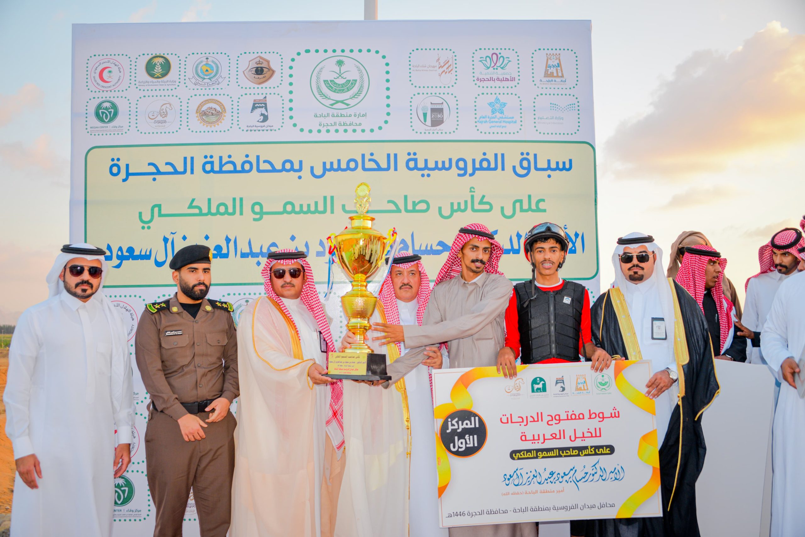 الباحة – تحت رعاية صاحب السمو الملكي الأمير الدكتور حسام بن سعود بن عبدالعزيز أمير منطقة الباحة، توّج محافظ الحجرة بندر بن سويلم العضيلة بحضور مديري الإدارات الحكومية والأهلية وجمهور من محبي وعشاف رياضة الفروسية الفائزين بكاسي سمو أمير المنطقة في المحفل الخامس لسباق الفروسية الذي انطلقت فعالياته عصر امس اليوم الجمعة بمركز الجرين بتنظيم من البلدية وجمعية التنمية ومربط دار الصافنات ضمن فعاليات شتاء الباحة ١٤٤٦ .