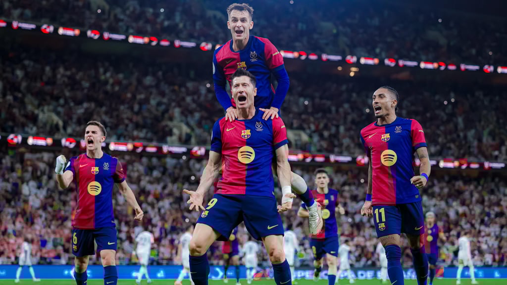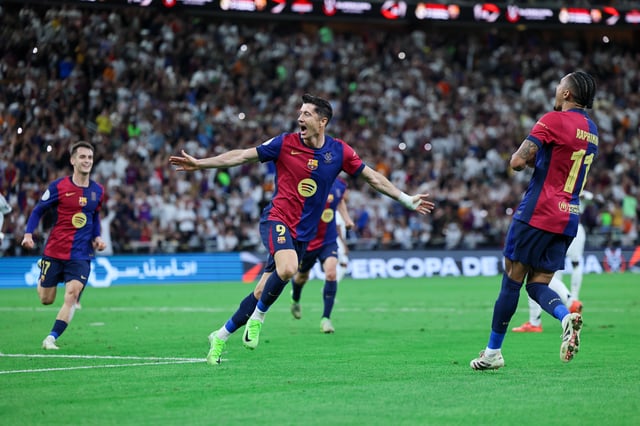 توج برشلونة بلقب السوبر الإسباني للمرة الخامسة عشرة في تاريخه، بعد أن كسب غريمه التقليدي ريال مدريد، بنتيجة 5-2 ، وذلك في اللقاء الذي جمع الفريقين مساء اليوم الأحد، على أرض ملعب مدينة الملك عبدالله الرياضية “الجوهرة المشعة” في جدة، بقيادة الحكم الإسباني “مانزانو”.