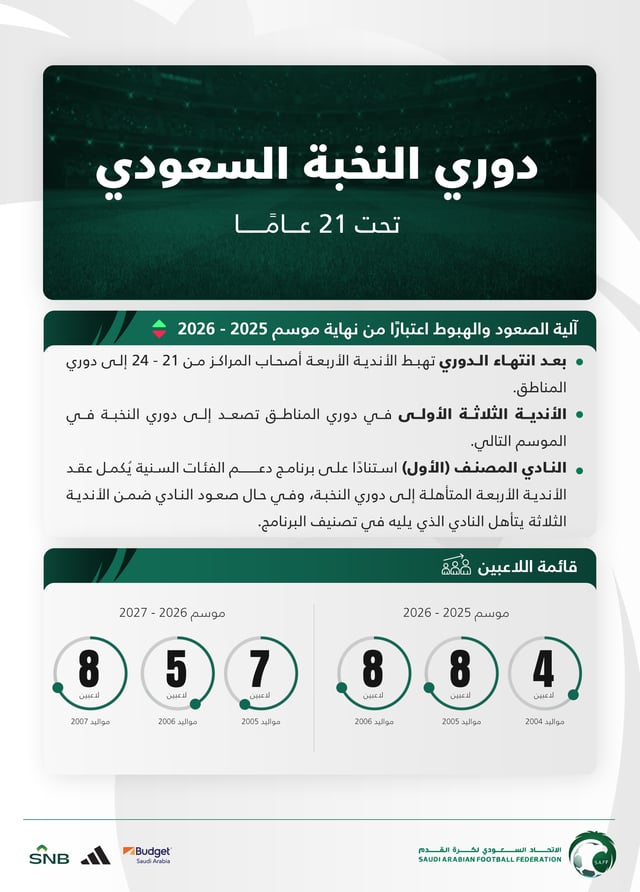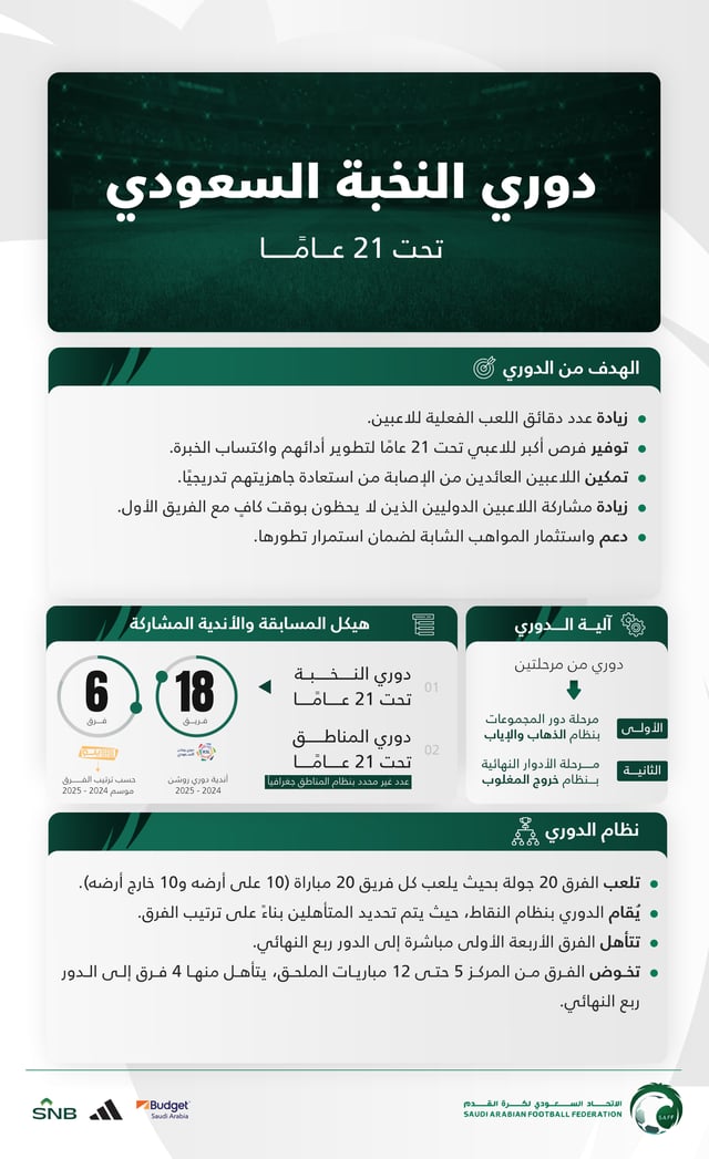 اعتمد مجلس إدارة الاتحاد السعودي لكرة القدم إطلاق دوري النخبة السعودي تحت 21 عاماً للموسم الرياضي المقبل 2025 ـ 2026، في خطوة تأتي بعد تقييم تجربة إطلاق الدوري الرديف، الذي أقيم على مدى موسمين وساهم في زيادة عدد دقائق اللعب للاعبين.