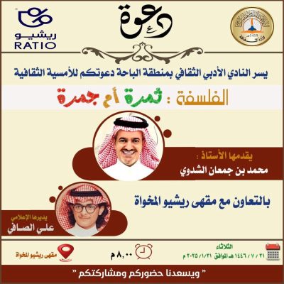 واوضح رئيس النادي الأدبي الشاعر حسن بن محمد الزهراني أن الفعاليات الثقافية التي يعمل عليها النادي الأدبي تأتي استكمالا لمسيرة العمل الثقافي وإثراء ميادينه بمحتوى إبداعي يترجم المستوى الذي وصلت إليه الثقافة في منطقة الباحة وتستلهم رؤية الوطن الطموحة من خلال الأماسي الثقافية التي تُساهم في استثمار الثقافة كفؤة ناعمة ويحرص النادي على تنويع الأوعية الثقافية لخلق حراك ثقافي يستثمر في إبداعات أبناء المنطقة بإبراز حضورهم عبر منصاته المختلفة وبالتعاون مع عدد من الجهات منها بلدية المخواة ومقهى ريشيو وهيئة التراث والغرفة التجارية وحديقة رواسي تهامة ومزرعة أرياف تهامة مضيفًاً أن أولى الأمسيات ستكون بمقهى ريشيو ببوليفارد المخواة مساء غد الثلاثاء الموافق ٢١ رجب ١٤٤٦ وهي عبارة عن أمسية فلسفية بعنوان : الفلسفة ثمرة أم جمرة ؟، يحييها الأستاذ محمد الشدوي ويديرها المذيع التلفزيوني علي الصافي، وسيشرع النادي منصاته لاستيعاب المواهب الإبداعية بإقامة أمسية شبابية يشارك فيها المبدعون : مصعب العطاف الغامدي ،أنس عبد المجيد الغبيشي، نجد حامد الغامدي، معن عبد الله الخيري، عبد الله فهد العمري