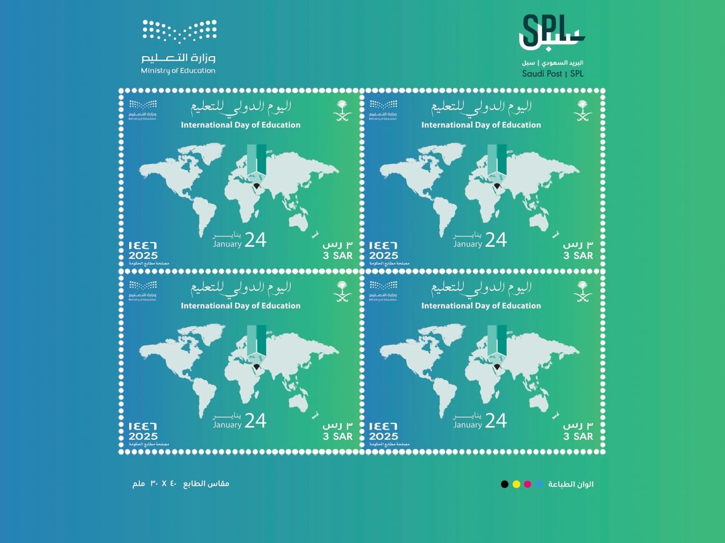 أصدرت مؤسسة البريد السعودي “سبل” بالتعاون مع وزارة التعليم طابعًا تذكاريًا بقيمة (3) ريالات بمناسبة اليوم الدولي للتعليم 2025.