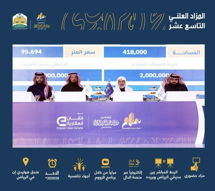 وفي التفاصيل، شهد المزاد في نسخته الحالية بيع 4 منتجات عقارية مميزة في الرياض والقصيم شملت ثلاثة قطع أراضي زراعية وفيلا سكنية تجارية بالرياض تم بيعها اليوم عبر المزاد العلني الحضوري المدمج والمرئي الذي انطلق اليوم الأحد 10 شعبان 1446هـ الموافق 9 فبراير 2025م وذلك في فندق هوليدي إن القصر بمدينة الرياض، وقاعة الحجاز في فندق موفنبيك في مدينة بريدة ، وإلكترونياً عبر منصة الدال للمزادات ومرئياً عبر برنامج الزووم عند الساعة الرابعة عصراً بتنافس مميز بين المستثمرين النخبة الذين أشادوا بحسن التنظيم وجودة المعروضات العقارية التي تواكب احتياجات السوق العقاري المحلي .