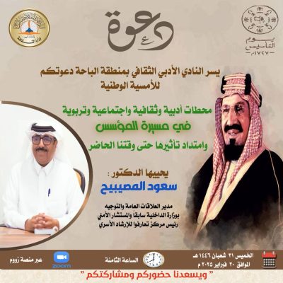 أدبي الباحة  يواصل مشهده الثقافي مع الدكتور سعود المصيبيح  للحديث عن المؤسس في يوم التأسيس