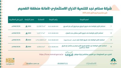 أعلنت شركة سنام نجد للتنمية، الذراع الاستثماري لأمانة منطقة القصيم، عن طرح أربع فرص استثمارية بمدينة بريدة وذلك خلال الربع الأول لعام 2025م، في إطار تعزيز النشاط الاقتصادي بالمنطقة ودعم الاستثمار المحلي، مما يسهم في تحقيق رؤية المملكة 2030 في تطوير المشاريع، ومن المقرر أن يكون آخر موعد لشراء الكراسة وتاريخ فتح المظاريف 16 شوال 1446هـ، داعية المستثمرين الراغبين في التنافس الاطلاع على الفرص، وتفاصيل المنافسة من خلال تطبيق الاستثمار البلدي (فرص).