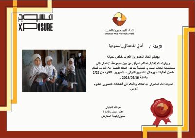 فازت عضو جمعية إعلاميون المصورة الفوتغرافية السعودية أماني القحطاني، بأن تكون صورتها “تحدي الجهل” ضمن مجموعة الأعمال التي سيضمها الكتاب السنوي لمنصة معرض اتحاد المصورين العرب، المقدم إلى مهرجان التصوير الدولي – “اكسبوجر” الذي تم خلال شهر فبراير ٢٠٢٥.