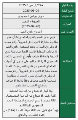 قررت لجنة الانضباط والأخلاق في الاتحاد السعودي لكرة القدم رفض الاحتجاج الذي تقدم به نادي النصر ضد نادي العروبة، والمتعلق بعدم نظامية مشاركة اللاعب رافع محمد الرويلي في المباراة التي جمعت الفريقين ضمن دوري روشن السعودي بتاريخ 28 فبراير 2025.