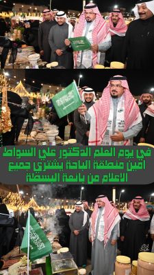 قام أمين منطقة الباحة، الدكتور علي بن محمد السواط، في لفتة إنسانية ووطنية، بشراء جميع الأعلام الوطنية من إحدى البائعات في السوق الرمضاني وسط مدينة الباحة، وذلك خلال جولته التفقدية لمهرجان “ليالي رمضان 2” الذي تنظمه الأمانة.