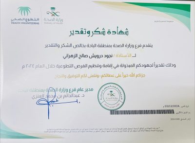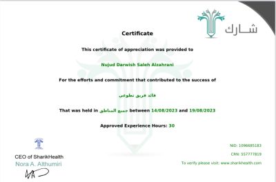 نجود الزهراني، أخصائية تمريض وطالبة في البورد السعودي تخصص تمريض طوارئ. متطوعة شغوفة وأحد سفراء التطوع الصحي، تعمل على تحقيق أثر إيجابي في المجتمع من خلال الحفاظ على الصحة السكانية ورفع الوعي الصحي.-