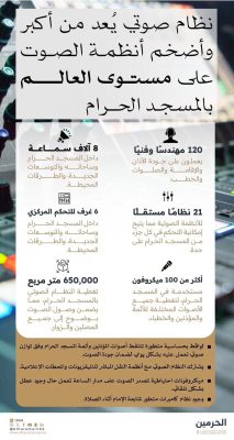 ويمتد النظام الصوتي ليغطي مساحة تُقدّر بـ 650 ألف متر مربع، ليضمن وصول الصوت بوضوح إلى جميع أرجاء المسجد، بما يعزز تجربة الزوار والمصلين ويجعلهم يعيشون روحانية المكان بكل صفاء.
