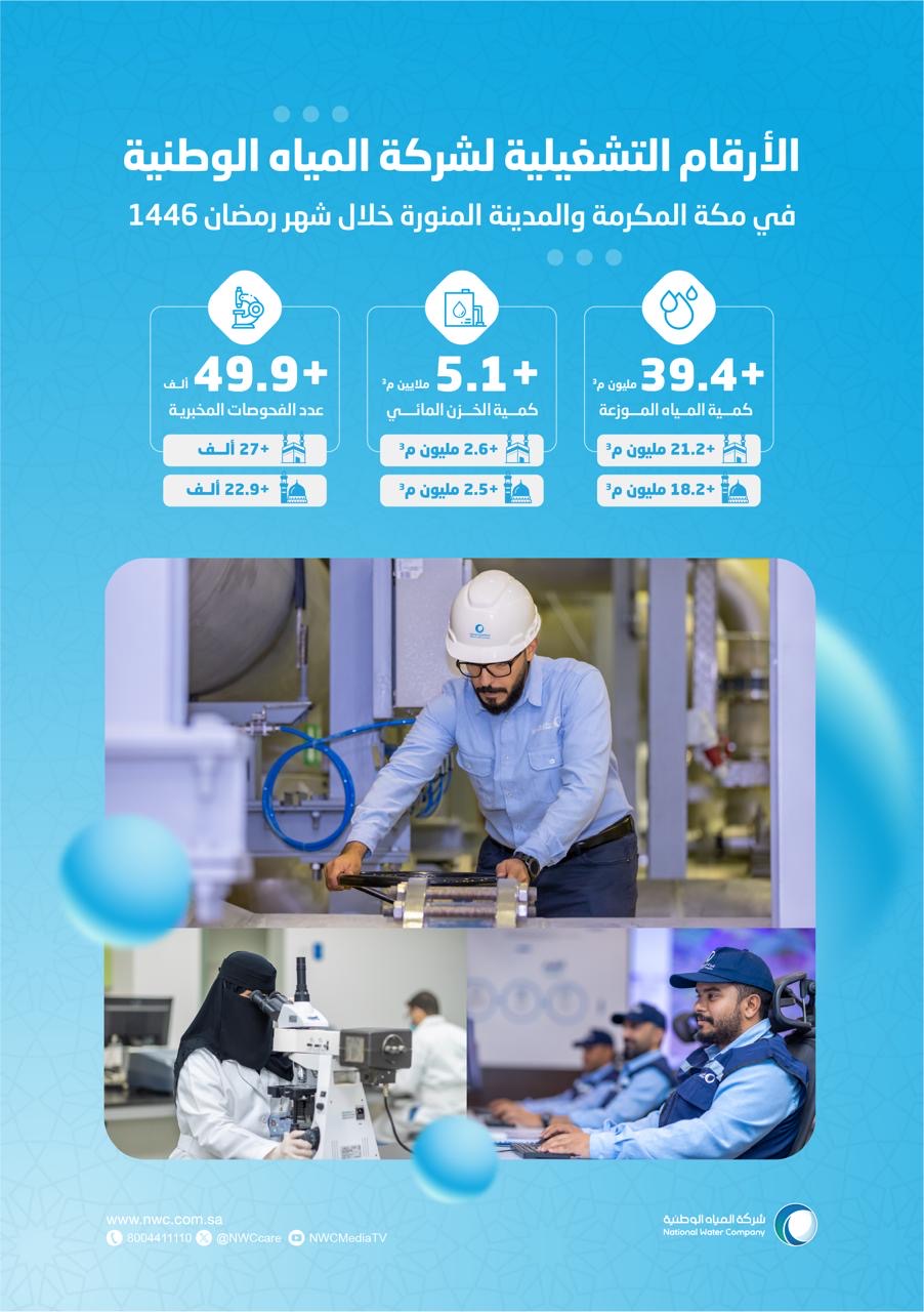 أعلنت شركة المياه الوطنية نجاح خطتها التشغيلية والفنية لتوفير المياه وإدارتها لموسم رمضان للعام 1446هـ بالحرمين الشريفين في مكة المكرمة والمدينة المنورة حيث وزعت أكثر من (39.4) مليون متر مكعب منها (21.2) مليون متر مكعب في مكة المكرمة ويقابلها (18.2) مليون متر مكعب في المدينة المنورة بمتابعة ومراقبة ذكية تضمن تقديم أرقى الخدمات للمعتمرين والزوار والسكان وأوضحت الشركة أن نجاح خطتها التشغيلية لموسم رمضان 1446هـ جاء – بعد توفيق الله – ونتاجًا للتخطيط والاستعداد لهذا الموسم منذ وقت مبكر وذلك بهدف المحافظة على مستوى جودة الخدمات المقدمة للسكان والزوار وضيوف الرحمن ، مبينةً أن ساعات ضخ المياه في الأحياء المخدومة بشبكات المياه بلغت 21 ساعة يوميًا وبضخ مستمر على مدار 24 ساعة إلى الحرمين الشريفين وذكرت أن خطتها التشغيلية تضمنت توفير خزن استراتيجي وتشغيلي بسعة تجاوزت (5.1) ملايين متر مكعب منها (2.6) مليون متر مكعب في مكة المكرمة و(2.48) مليون متر مكعب بالمدينة المنورة علاوة على تجهيز القوى البشرية العاملة وفرق التشغيل والصيانة المجهزة بالمعدات والآليات الحديثة لمباشرة جميع الأعمال الميدانية وفق أعلى المعايير بالإضافة إلى تجهيز محطات التعبئة “الأشياب” لضمان استمرار توفير المياه خلال موسم رمضان وحرصت الشركة على تقديم أرقى الخدمات للزوار والمعتمرين وضمان جودة المياه المقدمة لهم من خلال سحب العينات بشكل مستمر وتحليلها مخبريًا في مكة المكرمة والمدينة المنورة حيث تم إجراء أكثر من (49.9) ألف فحص مخبري للمياه منها (27) ألف بمكة المكرمة و(22.9) ألف فحص مخبري بالمدينة المنورة وذلك للتأكد من مطابقتها للمواصفات والمعايير المحددة وأكدت أن هذا النجاح جاء بتضافر الجهود والإعداد المسبق للخطط التشغيلية والاستراتيجية واستمرارًا لما توليه حكومة خادم الحرمين الشريفين -حفظه الله – وحرصها الدائم على تقديم أفضل الخدمات لضيوف الرحمن من معتمرين وزوار وتوفير جميع الخدمات والسبل التي تعينهم وتمكنهم من أداء مناسكهم وعباداتهم بيسر وطمأنينة .