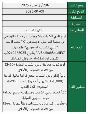 وتضمن قرار لجنة الانضباط فرض الغرامة على نائب رئيس النادي، محمد الناصر، بسبب تصريحاته الإعلامية المسيئة تجاه حكم المباراة، مما يعد انتهاكًا للمادة (250) من لائحة الانضباط والأخلاق. كما تم تحذير الناصر من تكرار مثل هذه التصريحات في المستقبل.