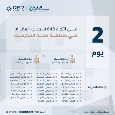 أعلنت الهيئة العامة للعقار عن قرب انتهاء المهلة المحددة للتسجيل العيني الأول للعقار لـ(19.239) قطعة عقارية في (26) حياً بمنطقة مكة المكرمة وذلك بنهاية يوم الخميس القادم 26 شوال 1446هـ الموافق 24 أبريل 2025م ودعت الهيئة ملاك العقارات الواقعة ضمن نطاق الأحياء التالية: (جزء من حي الصفوة، جزء من حي دار السلام ، جزء من حي النسيم، جزء من حي الشميسي ، جزء من حي التروية، جزء من حي الراشدية، جزء من حي الكوثر، جزء من حي طيبة، جزء من حي عين شمس، جزء من حي الحطيم، جزء من حي العوالي، جزء من حي العمرة، جزء من حي الشهداء، جزء من حي الكعكية، جزء من حي جبل النور، جزء من حي الجامعة، جزء من حي الضيافة، جزء من حي أحد،، جزء من حي الحمراء، جزء من حي الفرقان، جزء من حي العسلية، أجزاء من حي وادي جليل، أجزاء من حي جعرانة، أجزاء من حي الصفا، أجزاء من حي الغزيات، أجزاء من حي المقام) إلى سرعة المبادرة بتسجيل عقاراتهم من خلال منصة السجل العقاري قبل انتهاء مدة التسجيل للاستفادة من خدمات تنفيذ التصرفات العقارية وتوثيق جميع التغييرات التي تطرأ على العقار وأوضحت ” الهيئة ” أنّ السجل العقاري سيصدر “رقم عقار” وصك تسجيل ملكية لكل وحدة عقارية يتم تسجيلها ويتضمن صك تسجيل الملكية الجديد الموقع الجغرافي الدقيق للعقار وبيانات مالكه وأوصافه وحالته وما يتبعه من حقوق والتزامات وجميع التصرفات العقارية التي تطرأ عليه ليكون أساسًا في توثيق الملكية والحقوق العقارية المترتبة عليها بما يُسهم في استدامة وتعزيز القطاع العقاري والممكنات الرئيسة له وأكدت الهيئة أنّ عدم تسجيل العقارات خلال المدة المحددة في قرار الإعلان يعرض ملاكها للغرامات المالية الواردة في نظام التسجيل العيني للعقار والتي تحددها لجنة مختصة بالنظر في المخالفات وأنَ طلبات التسجيل العيني للعقار مستمرة في جميع المناطق المعلنة حتى بعد انتهاء مدة التسجيل المحددة في قرار الإعلان ، يذكر أن الشركة الوطنية لخدمات التسجيل العيني للعقار (السجل العقاري) تتولى مهمة تنفيذ أعمال إنشاء وإدارة السجل العقاري في المملكة باستخدام التقنيات الحديثة والبيانات الجيومكانية عبر منصة رقمية متكاملة تُسهم في تعزيز الشفافية والثقة بخدمات وبيانات العقارات .