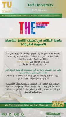 الطائف – أدرجت جامعة الطائف ضمن تصنيف التايمز للجامعات الآسيوية لعام 2025 (Asia University Rankings 2025)، الصادر عن مؤسسة Times Higher Education (THE)، وذلك ضمن الفئة 251-300 على مستوى جامعات قارة آسيا.