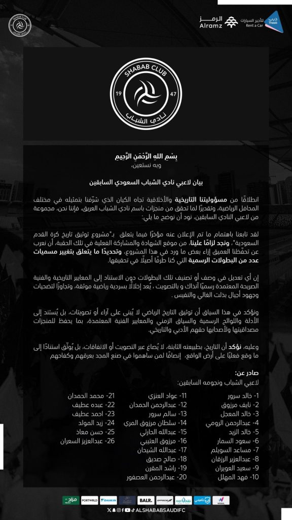 وقد وقّع على البيان 26 لاعبًا من أبرز من مثّلوا نادي الشباب عبر تاريخه، من بينهم سعيد العويران، ومرزوق العتيبي، وعبده عطيف، وأحمد عطيف، وحسن معاذ، في موقف موحّد يعكس حرصهم على الدفاع عن تاريخ ناديهم وصون مكتسباته.