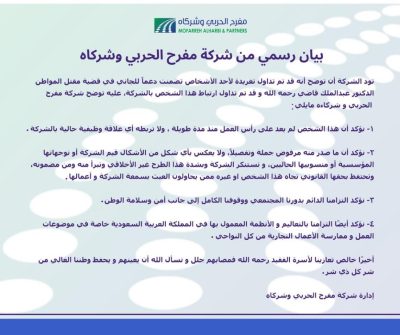 الرياض – أصدرت شركة مفرح الحربي وشركاه بيانًا رسميًا نفت فيه أي علاقة لها بأحد الأشخاص الذين تم تداول تغريدة له تتضمن دعمًا لأحد أطراف قضية الدكتور عبدالملك قاضي – رحمه الله -، موضحة أن هذا الشخص لم يعد على رأس العمل منذ مدة طويلة، ولا تربطه أي صلة وظيفية حالية بالشركة.