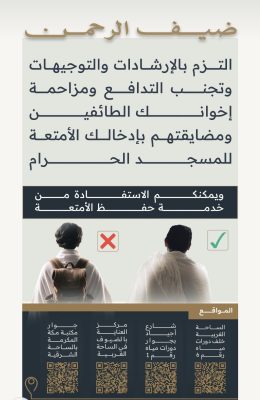 الهيئة دغت ضيوف الرحمن الالتزم بالإرشادات والتوجيهات،وتجنب التدافع والمزاحمة ومضايقت الطائفين وزوار الروضة الشريفة بإدخال الأمتعة.