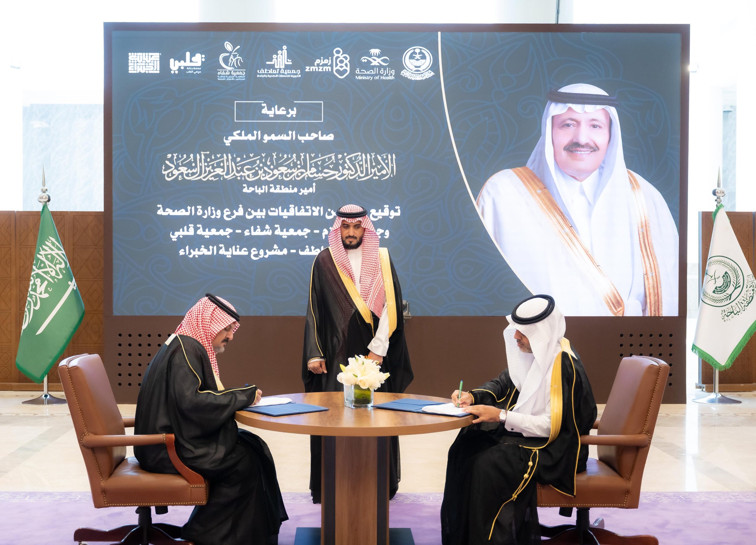 الباحة – برعاية صاحب السمو الملكي الأمير الدكتور حسام بن سعود بن عبدالعزيز أمير منطقة وامتدادًا لحرصه على دعم القطاع الصحي وتعزيز الشراكات التنموية المستدامة شهد وكيل إمارة المنطقة الدكتور عبدالمنعم بن ياسين الشهري، وذلك بديوان الإمارة اليوم توقيع عدد من الاتفاقيات الصحية ومذكرة تفاهم بين فرع وزارة الصحة بالمنطقة وكلاً من : مركز الخبراء الطبي وعدد من الجمعيات الصحية غير الربحية واتفاقية أخرى بين جمعية تعاطف الخيرية وجمعية رعاية مرضى القلب .