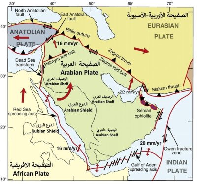 وأضاف : من خلال هذه الدراسات والأبحاث المستفيضة تم تقسيم الكرة الأرضية إلى عدة صفائح تكتونية ومنها الصفيحة العربية.