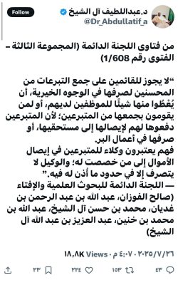 شدّد معالي وزير الشؤون الإسلامية والدعوة والإرشاد، الشيخ الدكتور عبداللطيف بن عبدالعزيز آل الشيخ، على عدم جواز منح القائمين على جمع التبرعات أو الموظفين العاملين في هذا المجال أي جزء من أموال التبرعات، مؤكدًا أنهم يُعدّون وكلاء عن المتبرعين، ولا يحق لهم التصرف خارج حدود الإذن الممنوح لهم.