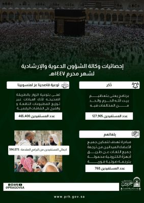 وبذلك، بلغ إجمالي عدد المستفيدين من البرامج الدعوية والتوعوية التي قدمتها الرئاسة خلال شهر محرم بالمسجد الحرام 594,073 مستفيدًا.