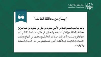 وجه صاحب السمو الملكي الأمير سعود بن نهار بن سعود بن عبدالعزيز محافظ الطائف بإغلاق منتجع بالمحافظة شهد سقوط إحدى الألعاب والتحقيق في ملابسات الحادثة التي نتج عنها وقوع عدد من الإصابات حيث تم التعامل مع بعضها في الموقع وتلقت الاسعافات اللازمة من قبل الجهات المعنية، فيما نُقلت أخرى للمستشفى لاستكمال العلاج اللازم دون وفيات ولله الحمد.