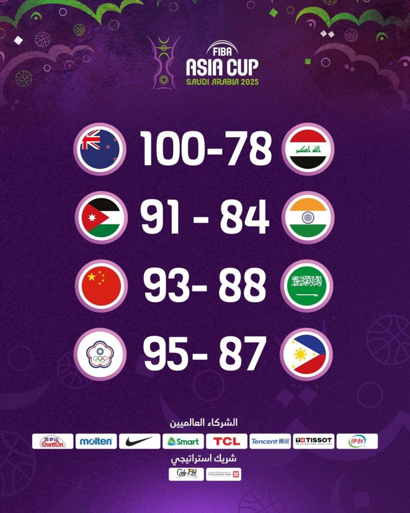 وفي مباراة أخرى، تغلب المنتخب الأردني على نظيره الهندي بنتيجة (91-84) بعد أداء متوازن وقوة هجومية مميزة، فيما خطف منتخب تايبيه الصيني فوزًا مهمًا أمام المنتخب الفلبيني بنتيجة (95-87) في لقاء شهد ندية كبيرة حتى الثواني الأخيرة.