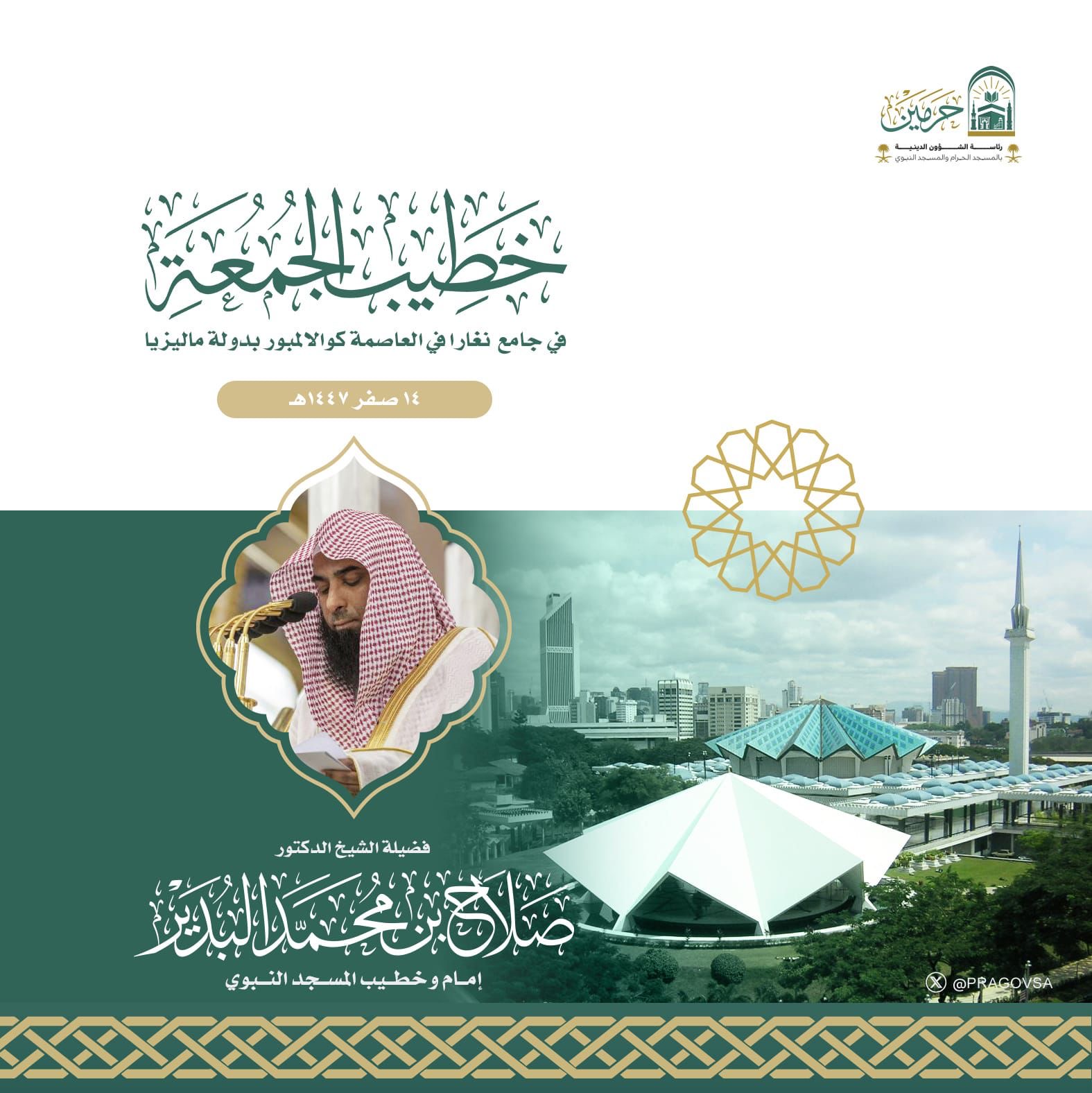 يُؤمّ فضيلة الشيخ الدكتور صلاح بن محمد البدير، إمام وخطيب المسجد النبوي الشريف، جموع المصلين يوم غدٍ الجمعة في جامع نغارا بالعاصمة الماليزية كوالالمبور، حيث يُلقي خطبة الجمعة، وذلك في إطار زيارته الحالية إلى ماليزيا.