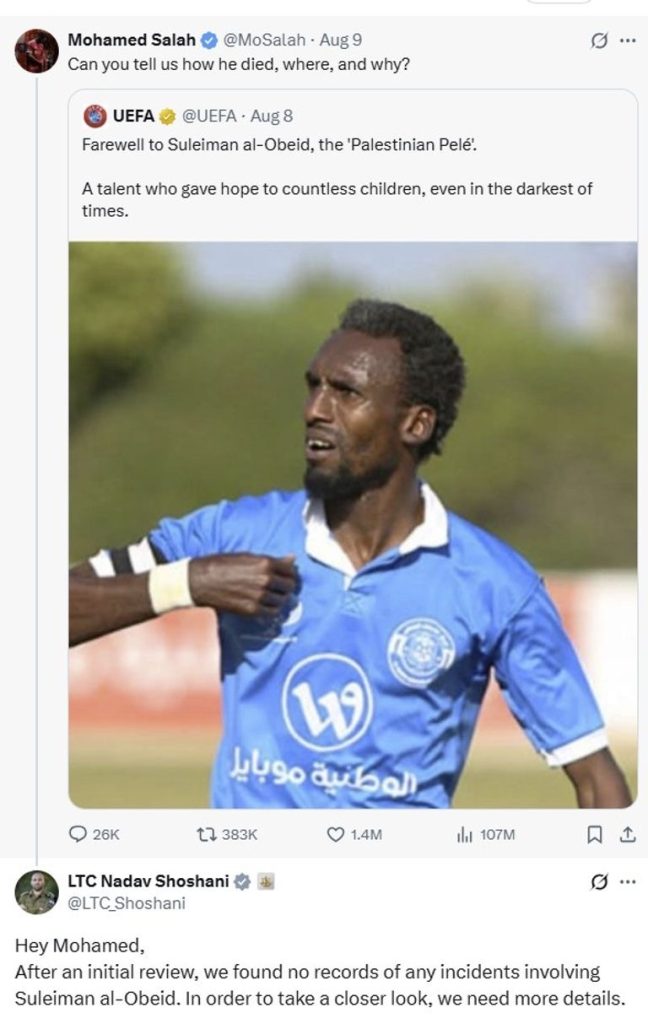 دخل الجيش الإسرائيلي في تفاعل مباشر مع نجم الكرة المصرية ونادي ليفربول الإنجليزي، محمد صلاح، بعد تساؤله العلني عن ملابسات مقتل اللاعب الفلسطيني السابق سليمان العبيد، المعروف بلقب “بيليه الفلسطيني”.