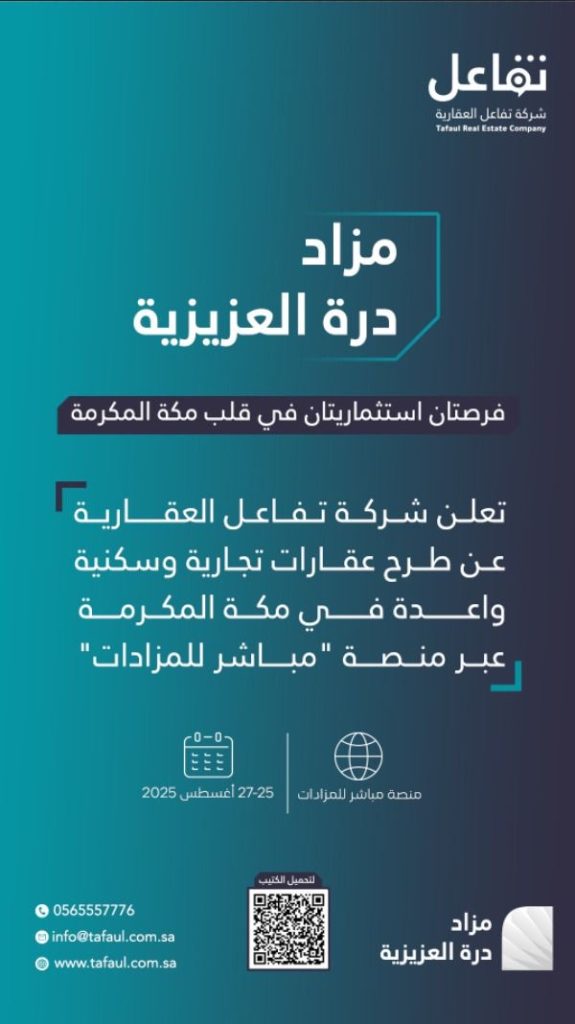 مكة المكرمة – أعلنت شركة تفاعل العقارية عن طرح فرصتين عقاريتين مميزتين للبيع بالمزاد العلني الإلكتروني ضمن مشروع “درة العزيزية”، وذلك عبر منصة مباشر للمزادات.