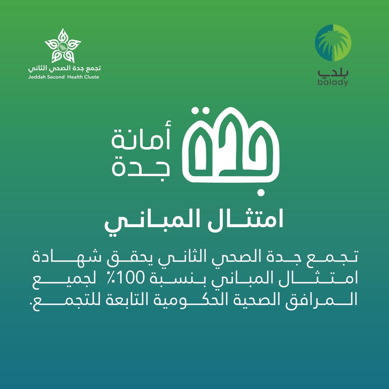 حقق تجمع جدة الصحي الثاني إنجازاً نوعياً على مستوى منطقة مكة المكرمة، وذلك بحصول جميع المرافق الصحية الحكومية التابعة له على شهادة امتثال المباني بنسبة 100%.