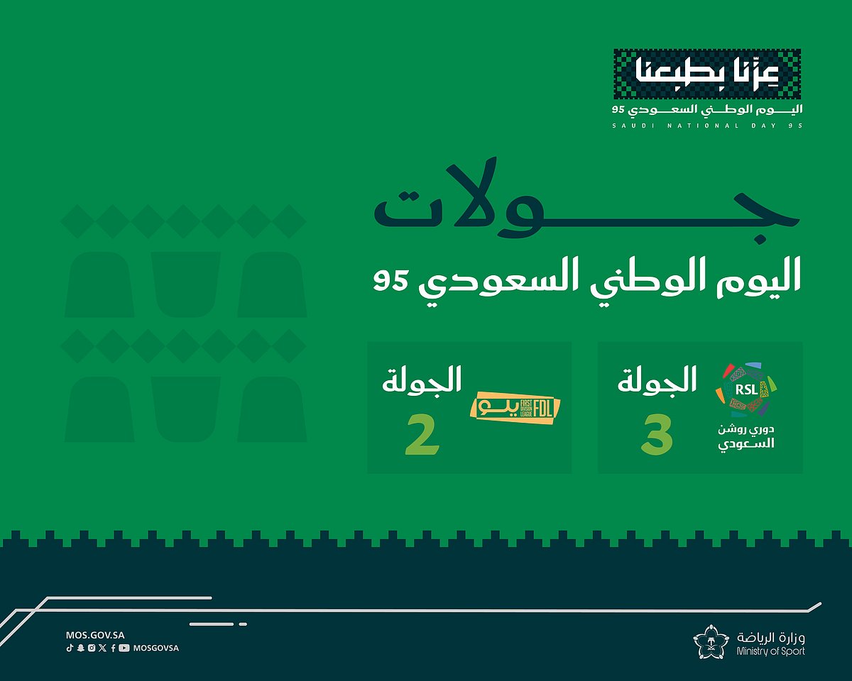 كما وجه سموه بتسمية الجولة الثانية من دوري الدرجة الأولى (دوري يلو) والجولة الثانية من دوري الدرجة الثانية بجولة (#عزّنا_بطبعنا) ، إضافة للاحتفال في جميع المسابقات والمنافسات بمختلف الألعاب الرياضية الأخرى، وذلك بمناسبة اليوم الوطني السعودي 95.