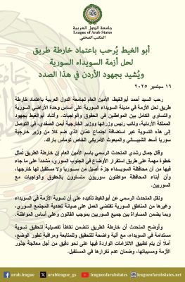 رحب الأمين العام لجامعة الدول العربية أحمد أبو الغيط باعتماد خارطة طريق لحل الأزمة في مدينة السويداء السورية، مؤكدًا أنها تقوم على وحدة الأراضي السورية والمساواة بين المواطنين في الحقوق والواجبات.