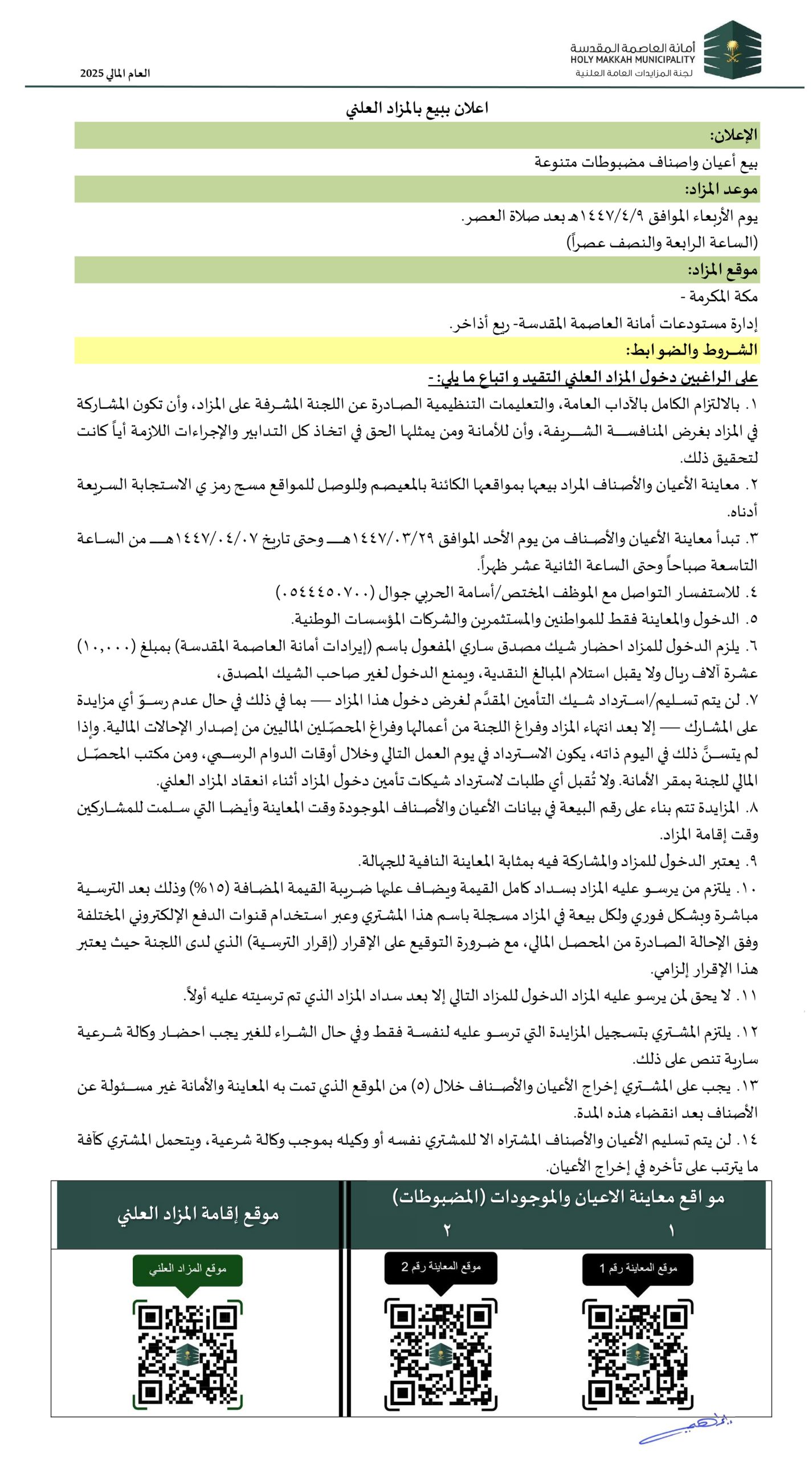 تُنظم أمانة العاصمة المقدسة يوم الأربعاء 9 ربيع الآخر 1447هـ، بعد صلاة العصر (الساعة 4:30 عصرًا)، مزادًا علنيًا لبيع أعيان وأصناف مضبوطات متنوعة، وذلك بمقر إدارة مستودعات الأمانة في ريع ذاخر بمكة المكرمة.