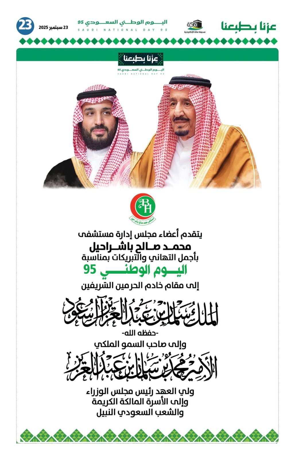 مكة المكرمة – رفع مجلس إدارة مستشفى محمد صالح باشراحيل أسمى آيات التهاني والتبريكات إلى خادم الحرمين الشريفين الملك سلمان بن عبدالعزيز آل سعود، وسمو ولي العهد رئيس مجلس الوزراء الأمير محمد بن سلمان بن عبدالعزيز – حفظهما الله – بمناسبة اليوم الوطني السعودي الـ95، سائلين المولى عز وجل أن يديم على المملكة عزها ونهضتها، ويحفظ قادتها ويسدد خطاهم.
