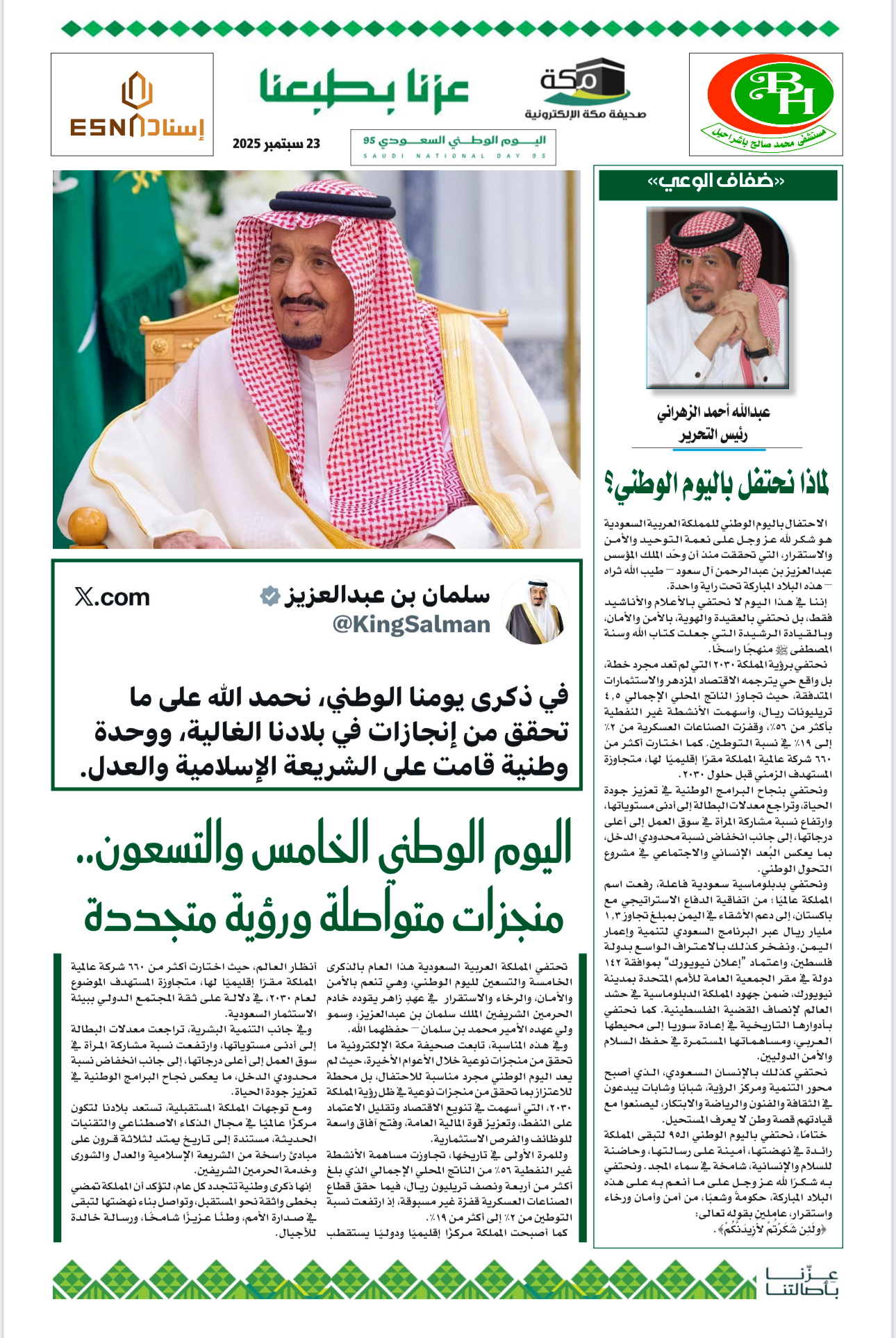 أصدرت صحيفة مكة الإلكترونية ملحقًا خاصًا باليوم الوطني السعودي الخامس والتسعين، يُعد الأضخم من نوعه في الصحافة السعودية، بمشاركة نخبة من أصحاب السمو والمعالي والسعادة وأساتذة التاريخ والإدارة والتخطيط والمثقفين والتربويين ونخبة من كتّاب الرأي من داخل المملكة وخارجها.