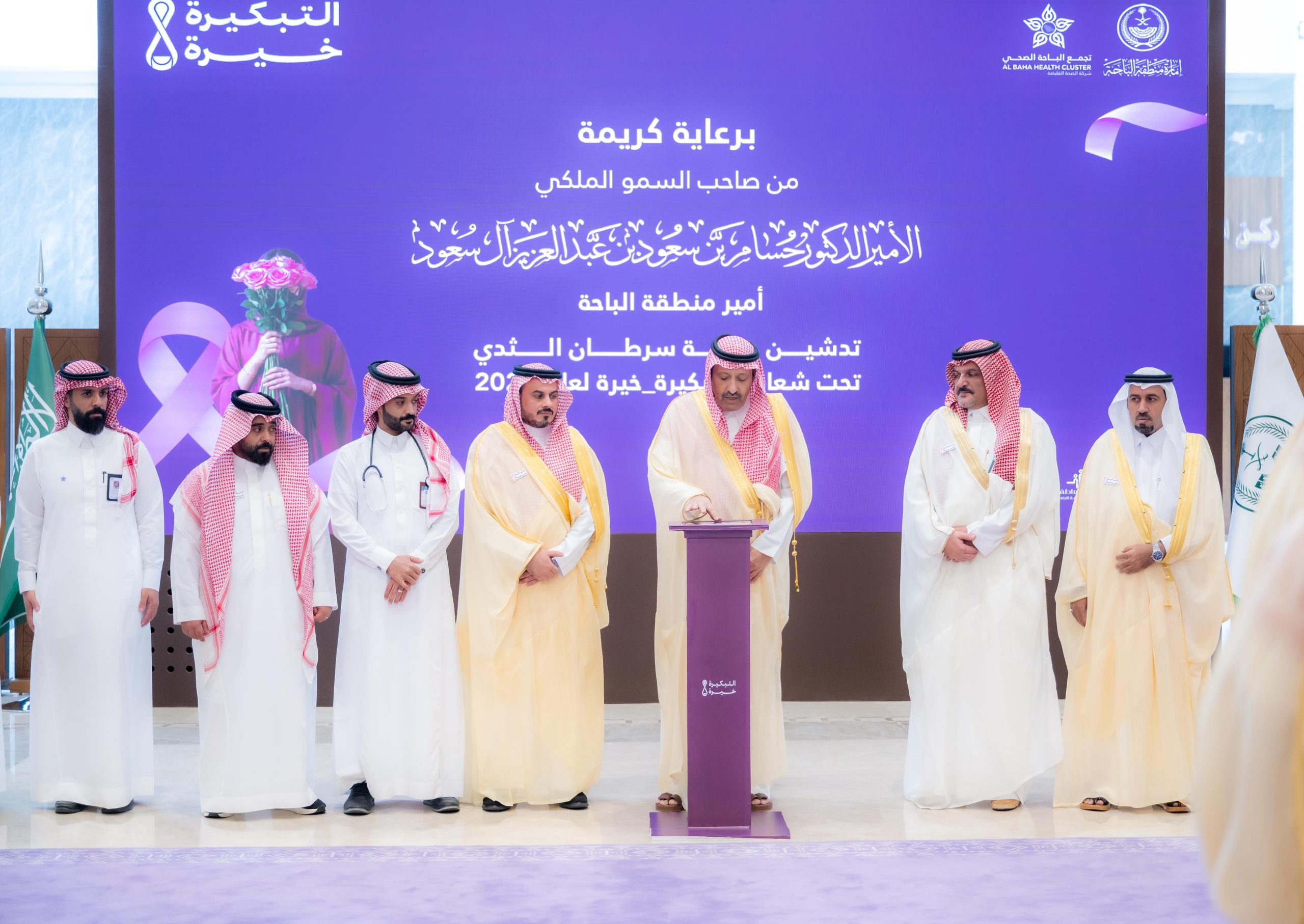 الباحة – دشّن صاحب السمو الملكي الأمير الدكتور حسام بن سعود بن عبدالعزيز أمير منطقة الباحة، فعاليات شهر التوعية بسرطان الثدي.وذلك بديوان الإمارة اليوم بحضور مدير عام فرع وزارة الصحة بالمنطقة الدكتور عبدالدائم محمد العنزي والرئيس التنفيذي لتجمع الباحة الصحي الدكتور مشبب بن سعيد الأسمري.