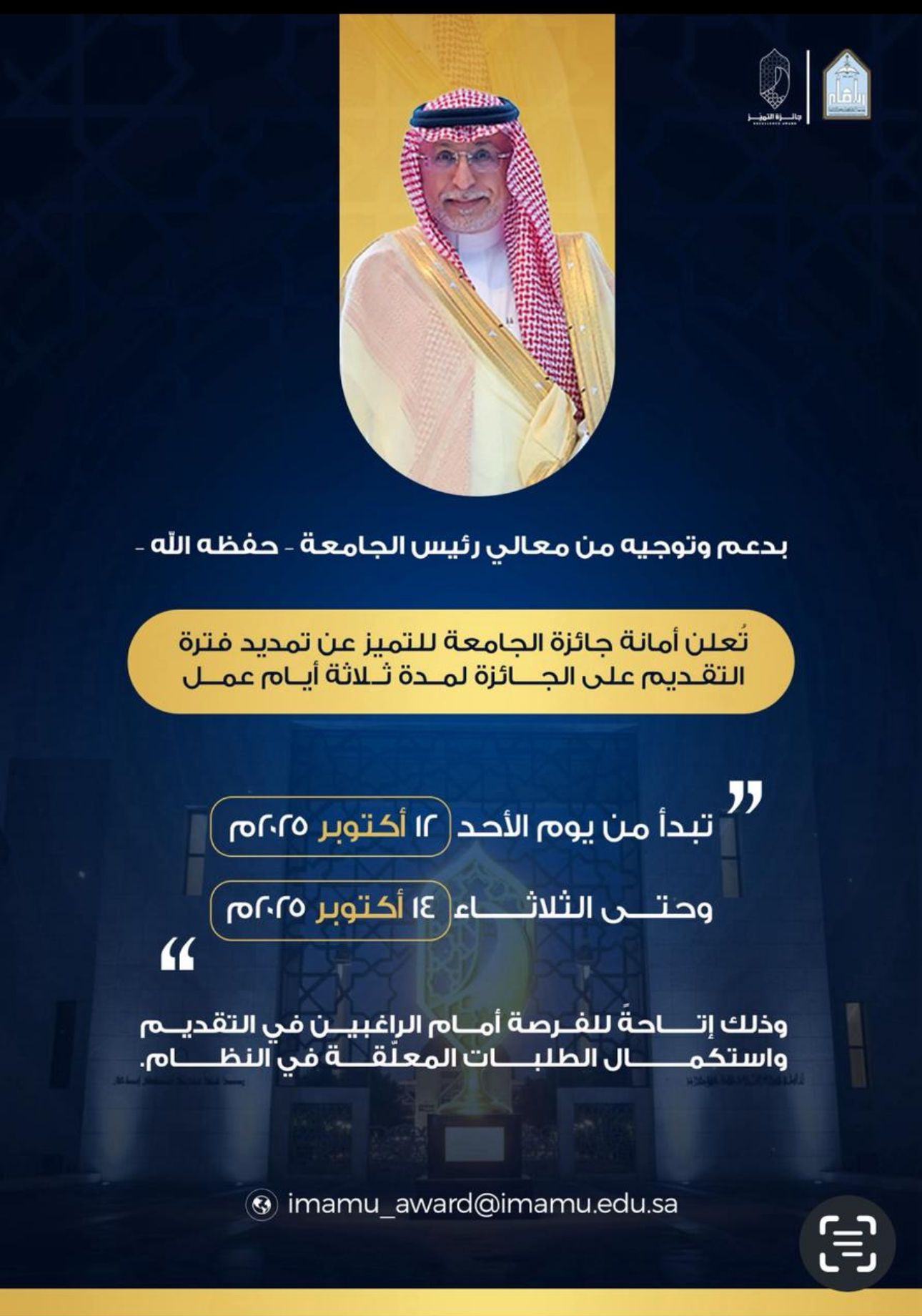 أعلنت أمانة جائزة الجامعة للتميز عن تمديد فترة التقديم على الجائزة لمدة ثلاثة أيام عمل، تبدأ من يوم الأحد 12 أكتوبر 2025م وحتى الثلاثاء 14 أكتوبر 2025م.