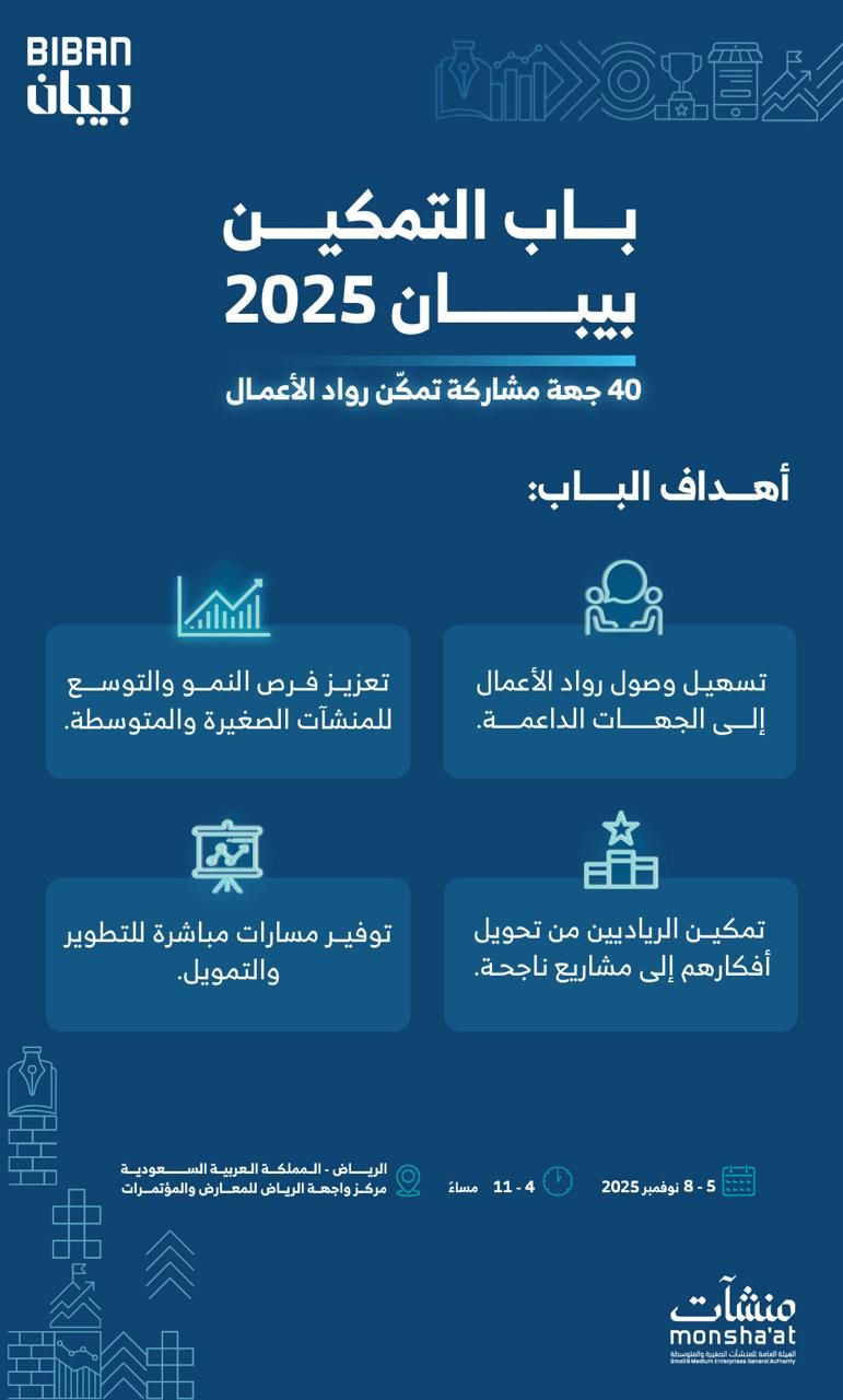تشهد فعاليات ملتقى “بيبان 2025″، الذي تنظمه الهيئة العامة للمنشآت الصغيرة والمتوسطة “منشآت” خلال الفترة من 5 إلى 8 نوفمبر المقبل في مركز واجهة الرياض للمعارض والمؤتمرات، مشاركة (40) جهة ممكنة من القطاع الحكومي والخاص وغير الربحي ضمن “باب التمكين”، الذي يهدف؛ إلى تعزيز فرص النمو والنجاح لرواد الأعمال وأصحاب المنشآت الصغيرة والمتوسطة.