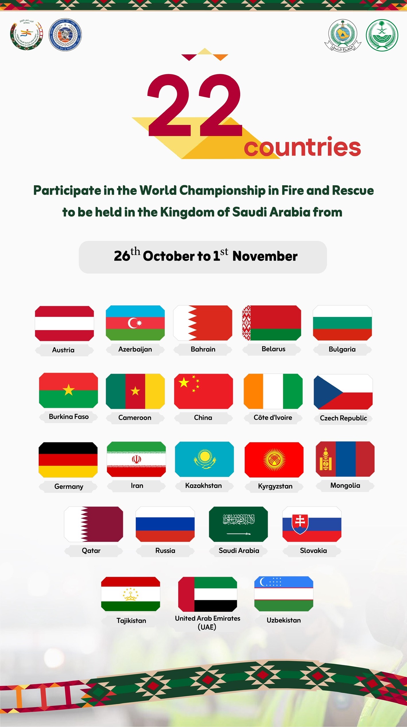 تستعد العاصمة الرياض يوم الاثنين 27 أكتوبر 2025م، لإجراء قرعة بطولة العالم لرياضة الإطفاء والإنقاذ، التي تُقام تحت مظلة الاتحاد الدولي لرياضة رجال الإطفاء والمنقذين (ISFFR)، بتنظيم مشترك بين المديرية العامة للدفاع المدني والاتحاد الدولي، وبمشاركة (21) دولة من مختلف قارات العالم.