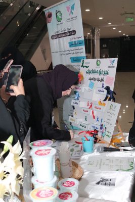 حيث تضافرت الجهود بهذا العمل المميز بمشاركة عدد من الفرق التطوعية التابعة للجمعية و عدد من الفرق التطوعية التابعه لجمعية البر الخيرية بالقريات في أحد أسواق المحافظه . بهدف رفع الوعي الصحي بأهمية الصحة النفسية وطرق دعمها من خلال ركن خاص باليوم العالمي للصحه النفسيه و ركن زاوية فضفضة نفسية للمستشارة النفسية هدى التسليم التي قدمت للحضور بعض النصائح و الإرشادات عن أهمية الصحة النفسية وكيف يمكن أن نحافظ عليها . وكذلك يهدف البرنامج إلى تعزيز السلوكيات وأنماط الحياة الصحية ، ونشر ثقافة الكشف المبكر عن سرطان الثدي وأهمية الفحص الذاتي والدوري.