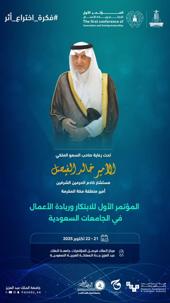 تُنظم جامعة الملك عبدالعزيز، برعاية من صاحب السمو الملكي الأمير خالد بن فيصل بن عبدالعزيز مستشار خادم الحرمين الشريفين أمير منطقة مكة المكرمة، “المؤتمر الأول للابتكار وريادة الأعمال في الجامعات السعودية”، تحت شعار “فكرة واختراع وأثر”، وذلك خلال الفترة 21 – 22 أكتوبر الجاري، بمشاركة من الجهات الحكومية والجامعات.