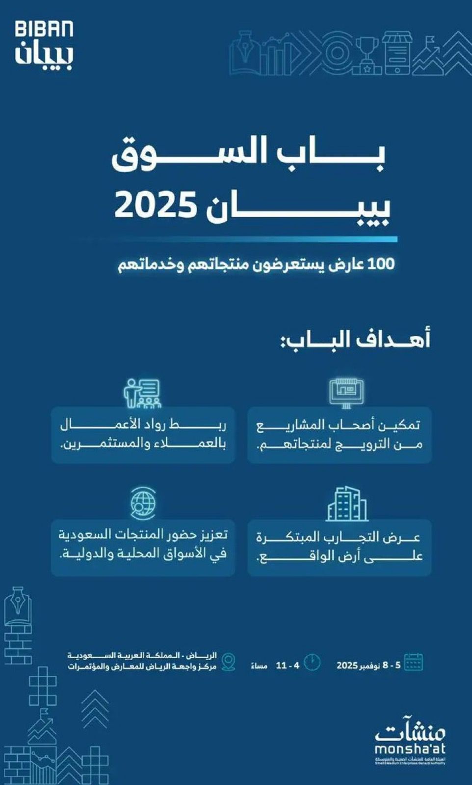 ٩يحتضن ملتقى “بيبان 2025″، الذي تنظمه الهيئة العامة للمنشآت الصغيرة والمتوسطة “منشآت” خلال الفترة من 5 إلى 8 نوفمبر المقبل في مركز واجهة الرياض للمعارض والمؤتمرات، تحت شعار “وجهة عالمية للفرص”، أكثر من (100) عارض من رواد الأعمال وأصحاب المنشآت الصغيرة والمتوسطة من داخل المملكة وخارجها ضمن ” باب السوق”.