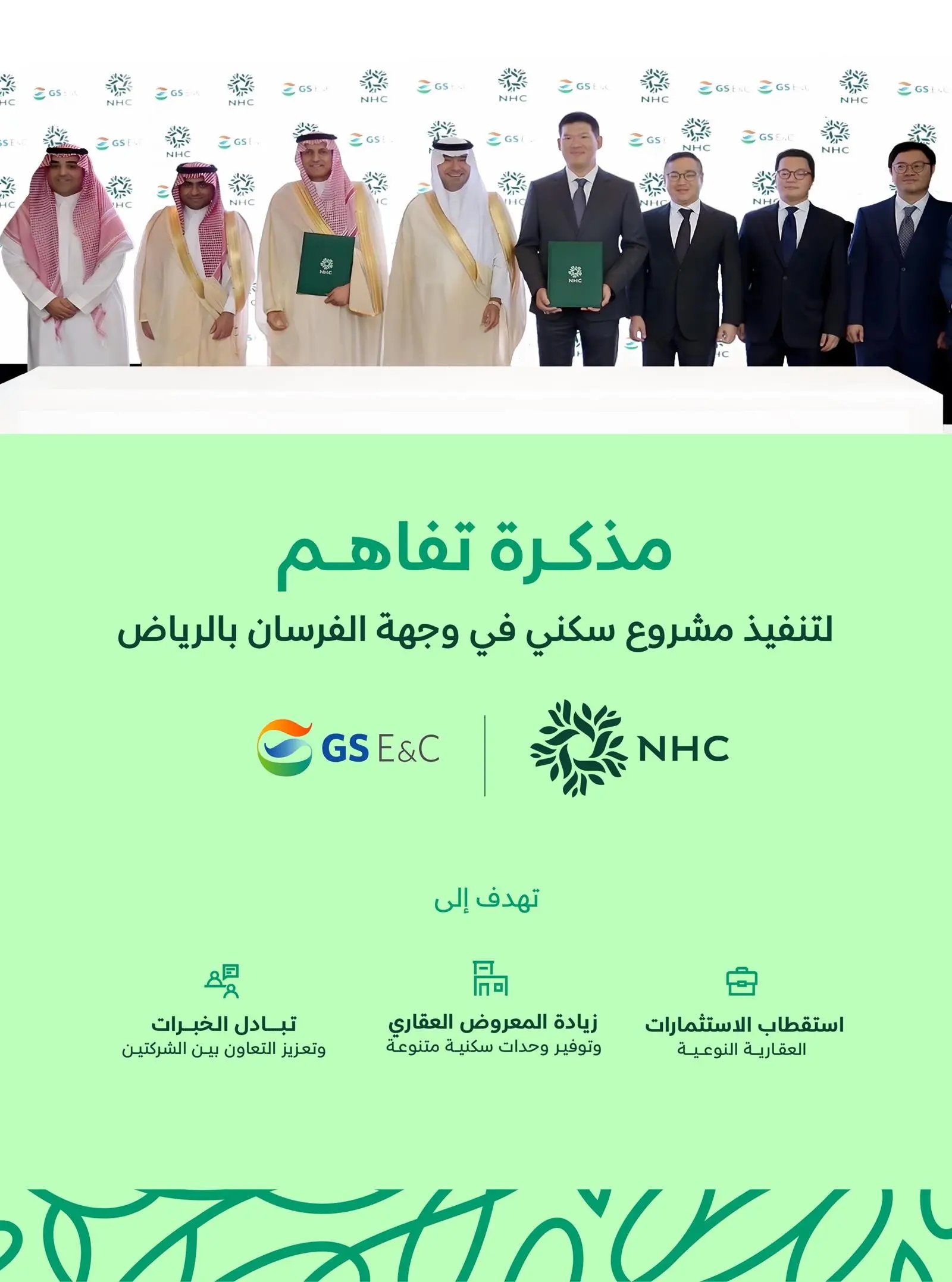 واس – وقّعت شركة “NHC” مذكرة تفاهم مع شركة “جي إس إنجنيرنيج كونستركشن” الكورية لتنفيذ مشروع نوعي في وجهة الفرسان، وذلك برعاية معالي وزير البلديات والإسكان الأستاذ ماجد بن عبدالله الحقيل بحضور الرئيس التنفيذي لشركة “NHC” محمد بن صالح البطي، في العاصمة الكورية سيئول.