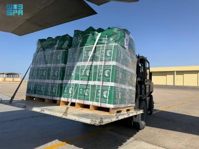 وتحمل الطائرة السعودية الـ(70) على متنها سلالًا غذائية وحقائب إيوائية، تمهيدًا لنقلها إلى المتضررين من الشعب الفلسطيني الشقيق داخل قطاع غزة.