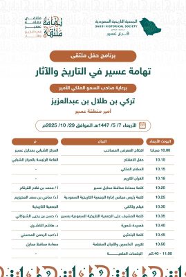 محايل : برعاية صاحب السمو الملكي الأمير تركي بن طلال بن عبدالعزيز آل سعود، أمير منطقة عسير ورئيس هيئة تطويرها،ينظم فرع الجمعية التاريخية السعودية بعسير الملتقى العلمي الخامس للجمعية تحت عنوان “تهامة عسير فيالتاريخ والآثار”، وذلك خلال الفترة من 7 إلى 8 جمادى الأولى 1447هـ، الموافق 29 إلى 30 اكتوبر 2025م، منالعاشرة صباحا حتى الثانية بعد الظهر في المركز الشبابي بمحافظة محايل عسير.