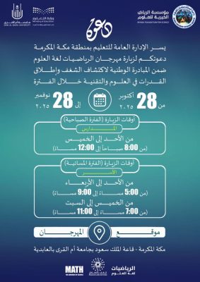 تعليم “مكه” يعلن مواعيد زيارة مهرجان الرياضيات لغة العلوم.