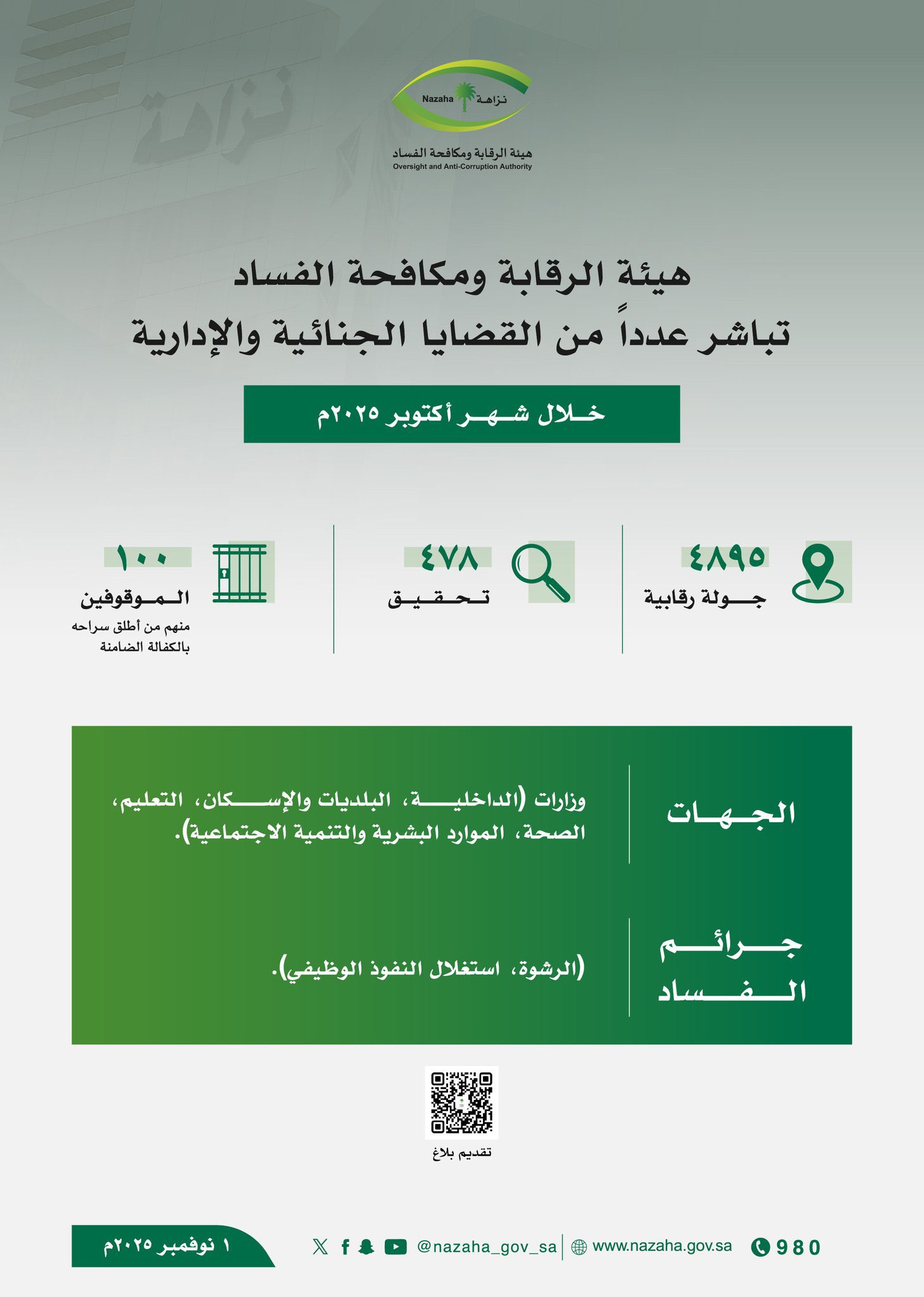 ‏‎قامت هيئة الرقابة ومكافحة الفساد توقف 1000 شخص خلال شهر إكتوبر 2025م، بعمل 4895 جولة رقابية ، تم فيها مباشزة عدداً من القضايا الجنائية والإدارية ، تم فيها إجراء 478 تحقيق  ، وأسفر ذلك على إيقاف 1000موقوف في عدد من الجهات.