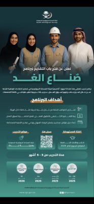‏أعلنت هيئة المساحة الجيولوجية السعودية ، ممثلة في أكاديمية هيئة المساحة الجيولوجية السعودية ، وعبر منشور لها على موقعها الرسمي على منصة (×) الإلكترونية ، عن بدء التقديم لبرنامج “صُنـــاع الغـــد”، والذي يستهدف طلاب وطالبات الجامعة المتوقع تخرجهم للعام الدراسي 2026م ، وذاك ابتداءً من الأحد المقبل الموافق 9 نوفمبر 2025م، ولمدة أسبوعين.