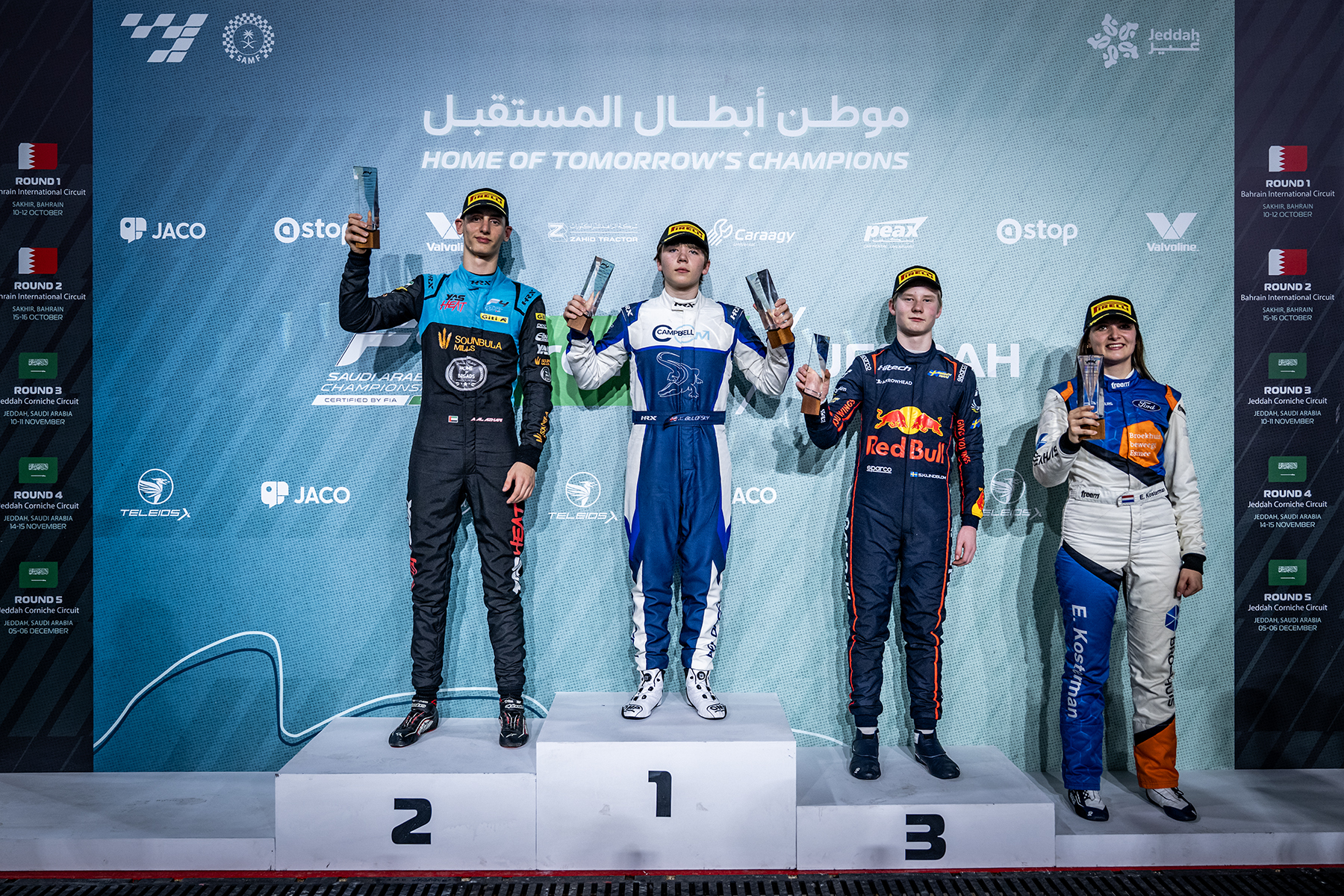 شهدت هذه الجولة أجواء مليئة بالحماس والتشويق، وسط أداء مميزمن السائقين الشباب الذين واصلوا تقديم مستويات متصاعدة فيالبطولة، وبالعودة إلى نتائج السباق تمكن البريطاني كيتبيلوفسكي سائق فريق بيكس من انتزاع المركز الأول بعد أن أنهىالسباق، متقدماً بفارق 5 ثوان، 495 جزءاً من الثانية، عن صاحبالمركز الثاني الإماراتي آدم الأزهري سائق فريق ڤالڤولين، فيما نجحالسويدي سكوت ليندبلوم من فريق ريد بُل من تحقيق المركز الثالثبفارق 5 ثوان، و633 جزءاً من الثانية عن صاحب المركز الأول، وجاءكلاً من تيبو رامايكرز، ولويس ويريل في المركزين الرابع والخامسعلى التوالي.